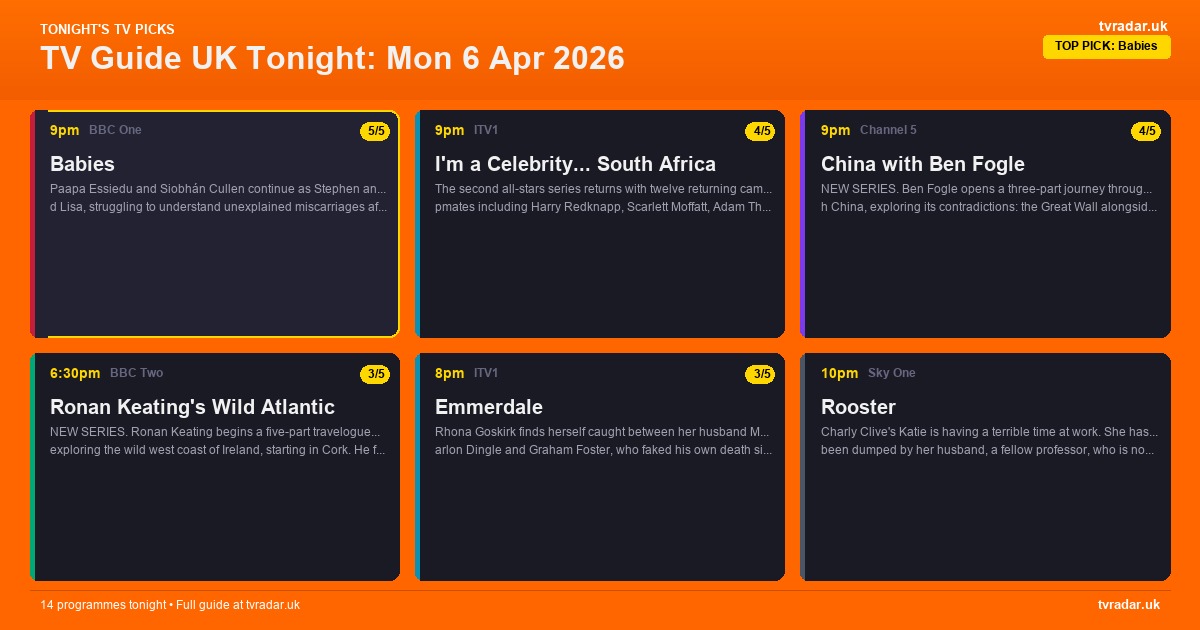 Related: What’s On TV Tonight Sunday | What’s On TV Tonight Sat 4 Apr 2026 | What’s On TV Tonight Mon 6 Apr 2026